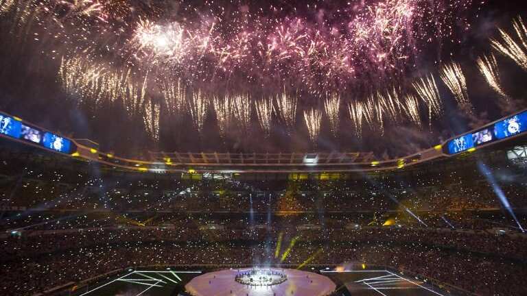 Los más aplaudidos fueron Sergio Ramos y Cristiano Ronaldo, que ondeó una bandera portuguesa al dejar los reflectores mientras se acercaba a a sus compañeros en un escenario en el centro de la cancha.