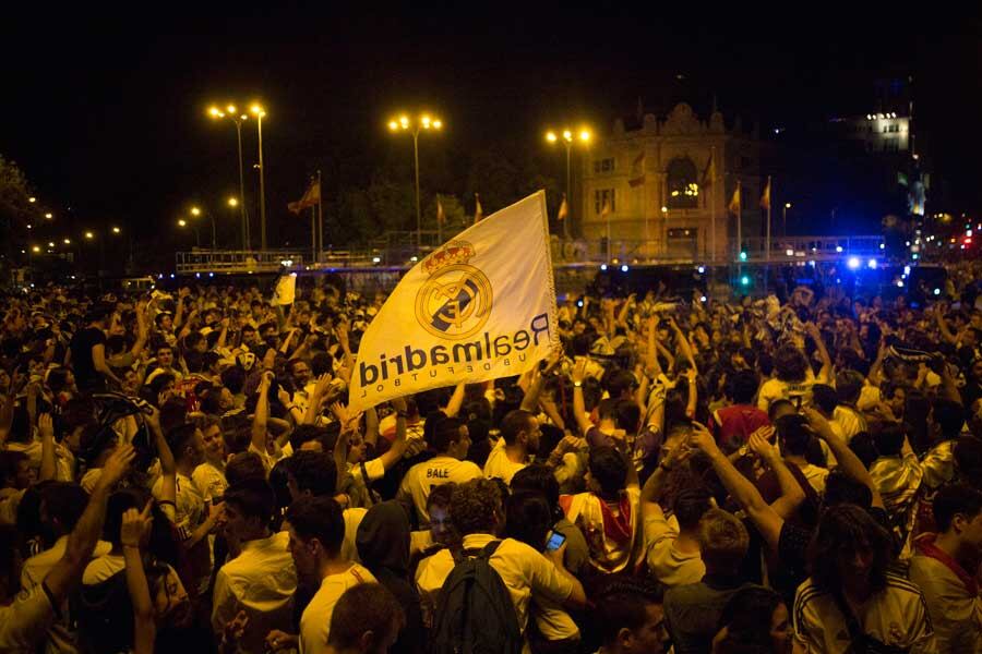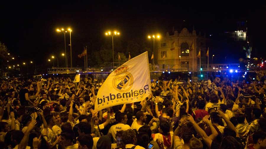 Al igual que hace dos semanas, cuando festejaron la consecución de la Liga española, Sergio Ramos colocó a la estatua de la diosa Cibeles una bandera con el escudo del Real Madrid, mientras el público coreaba "We are the champions" de Queen.