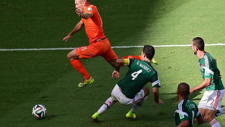 En la jugada, Robben, actual jugador del Bayern de Múnich alemán cayó dentro del área que defendía México sin haber sido tocado por Rafael Márquez pero el árbitro consideró que existió una falta y señaló el tiro a doce pasos.