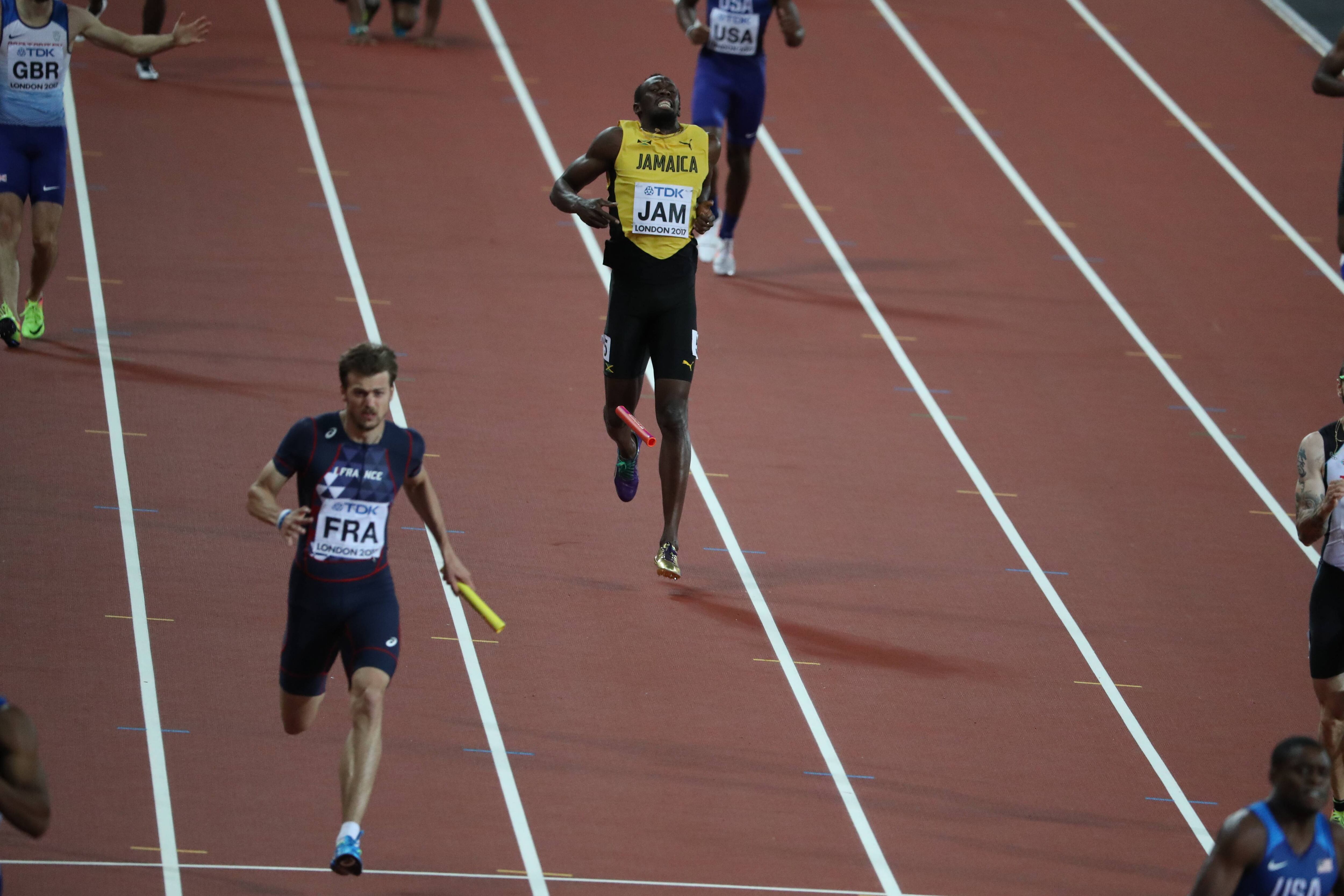 Al lado de sus compatriotas Omar McLeod, Julian Forte y Yohan Blake, Bolt disputó la prueba final en la penúltima jornada del Mundial y, entre la preocupación y el reconocimiento del público, fue despedido bajo una fuerte ovación del público que llenó el estadio Olímpico de Stratford.