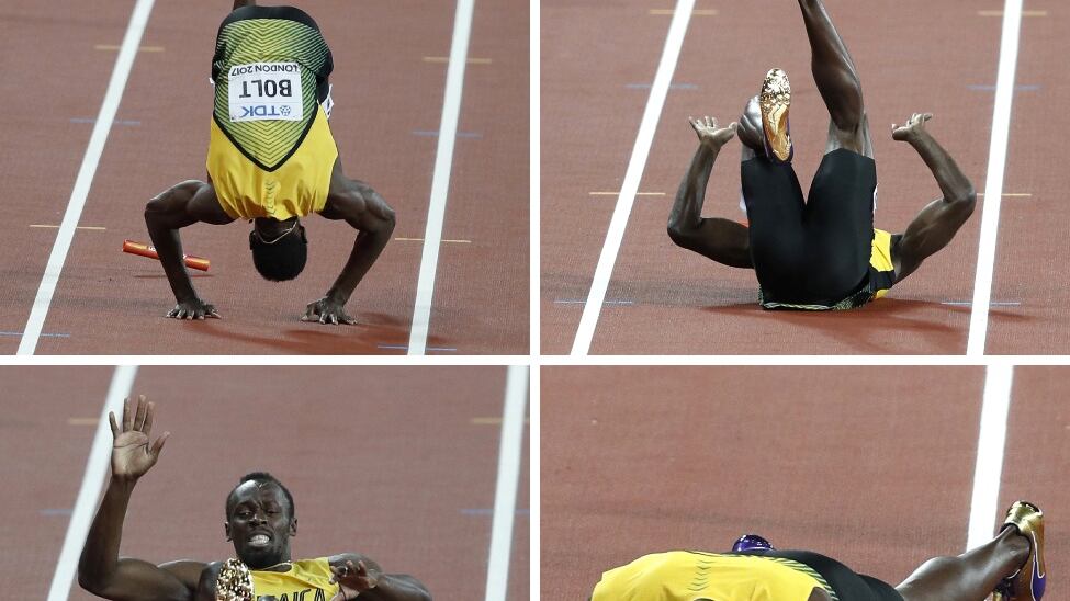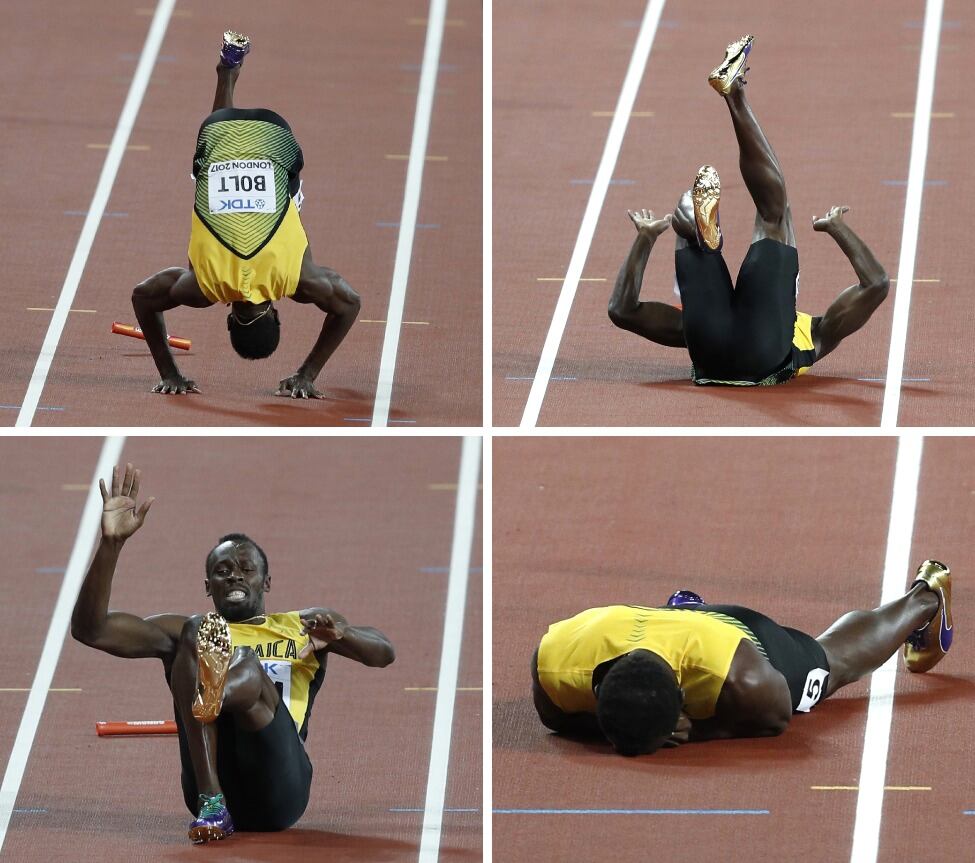 En la final, a unos 40 metros de la meta, Bolt aminoró el ritmo, quejándose de su pierna izquierda. El jamaicano trató de terminar la carrera pero desistió, quedando boca abajo, desconsolado.