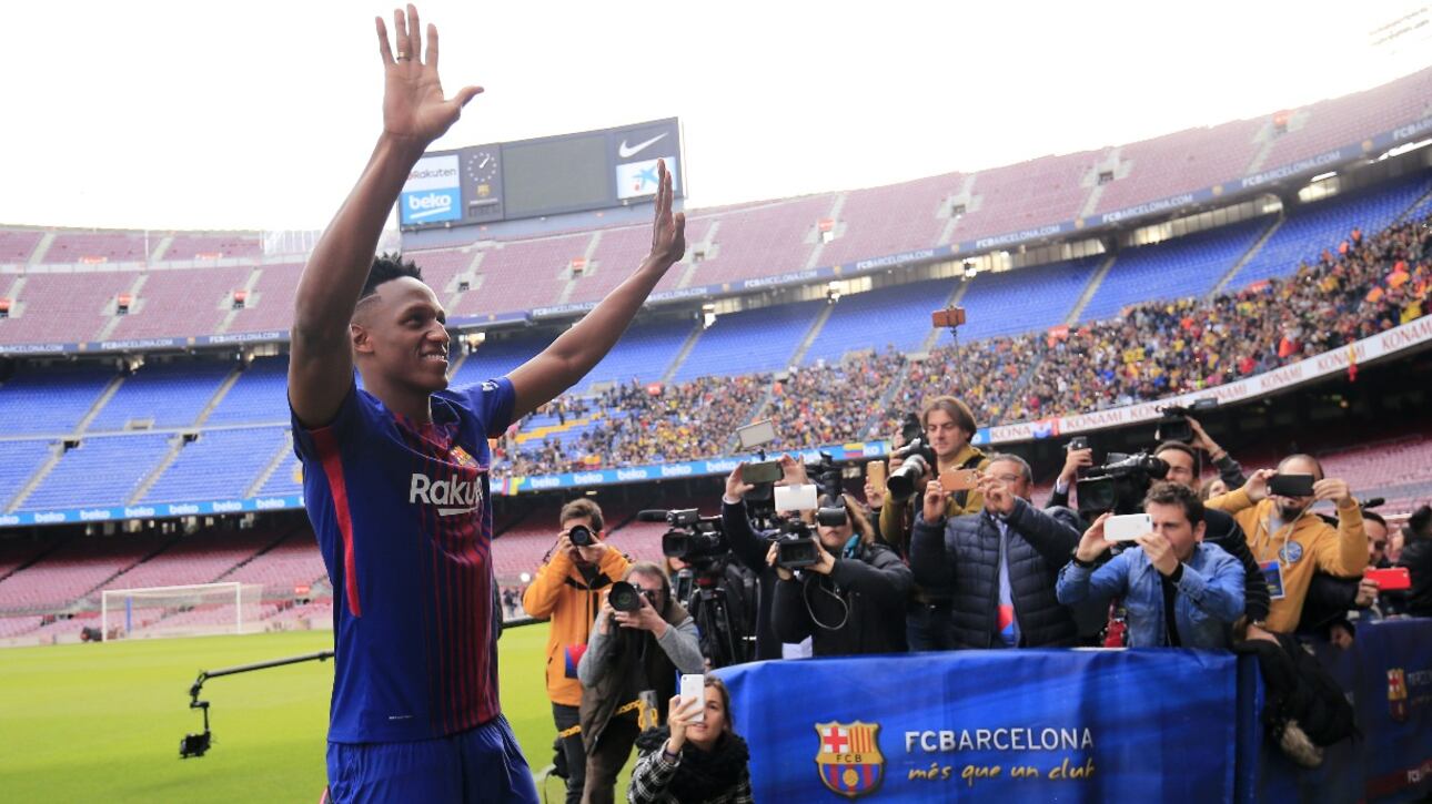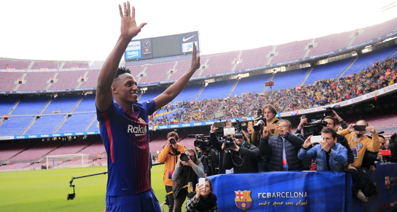 El colombiano Yerry Mina fue presentado este sábado como nuevo jugador del Barcelona, asegurando que quiere “hacer historia”, y dio una gran muestra de fe y devoción cuando entró al Camp Nou con los pies descalzos.