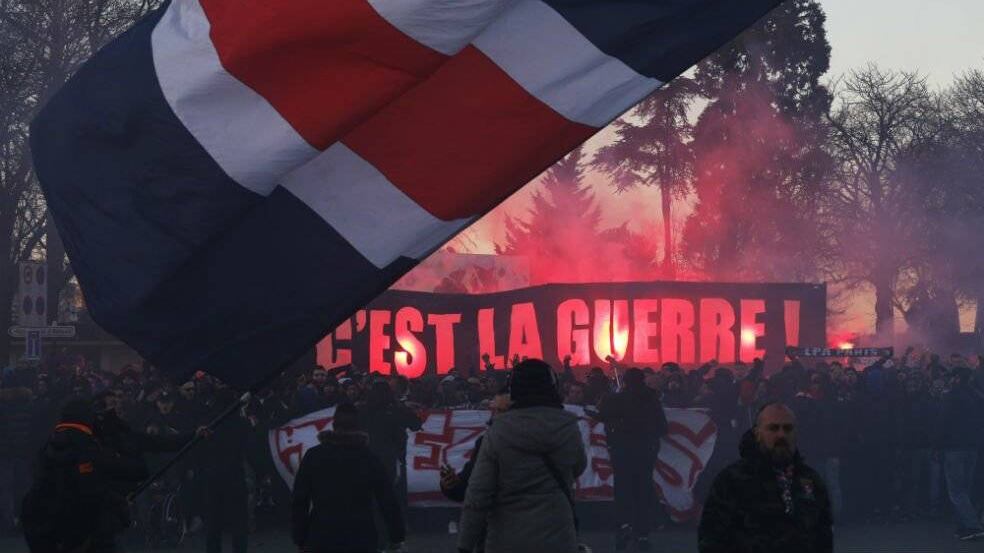Así, con bombos, estacas, pistolas de goma y pirotecnia, los hinchas del PSG pretendían ingresar en el hotel, pero fueron dispersados por la policía.