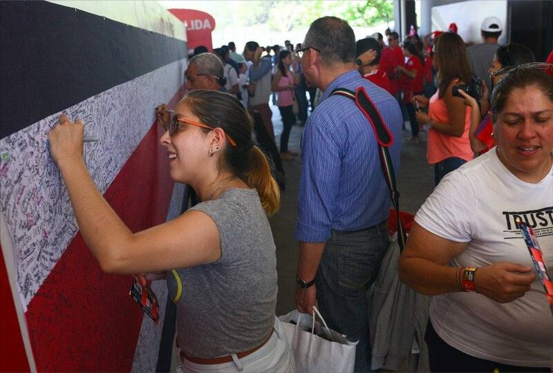 Luego el aficionado se encontró con el Trofeo, con el que se fotografía, y al final, con una gigantesca bandera de Costa Rica, la cual firmaron. Esta será entregada a la selección de ese país, antes de que parta a Rusia.