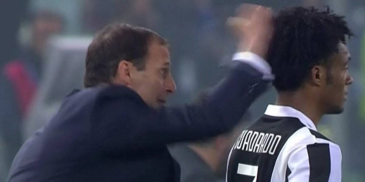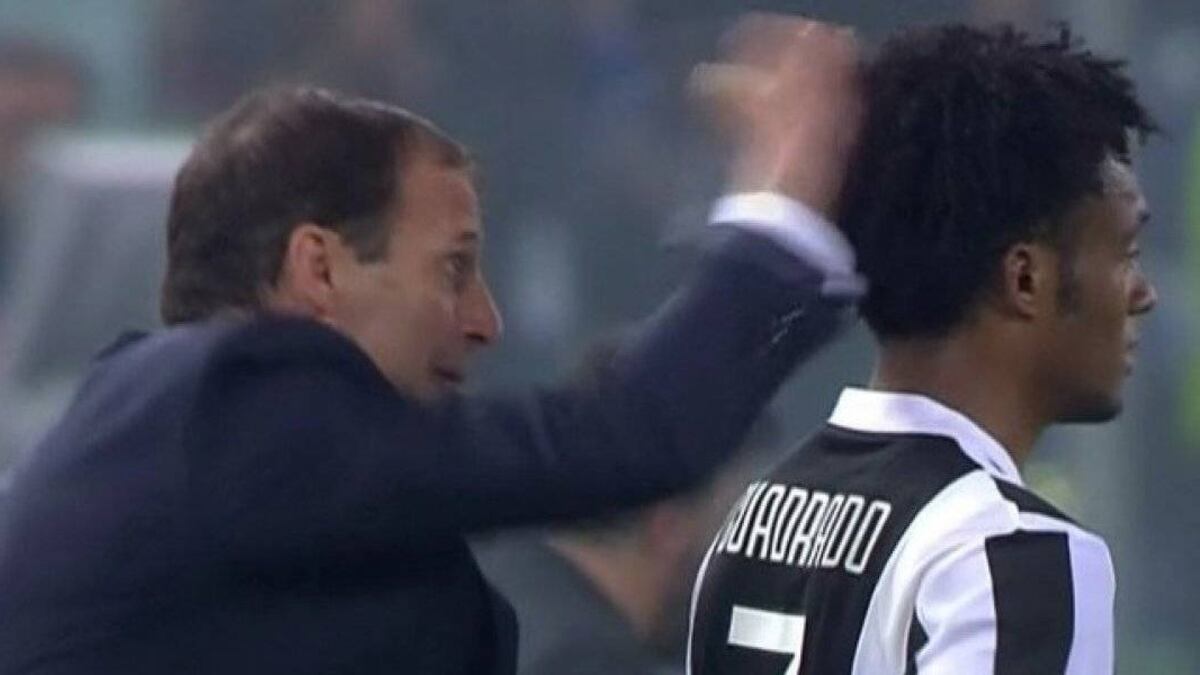 Tras el pitido final, Cuadrado cogió una lata de espuma y corrió hacia Massimiliano Allegri, se le montó en la espalda y lo roció con el líquido en la cabeza.