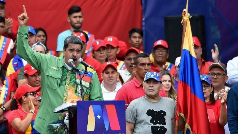 La leyenda del futbol argentino, flanqueó a Maduro al cerrar este jueves en Caracas su campaña para las elecciones del domingo, que podrían extenderle el mandato hasta 2025.