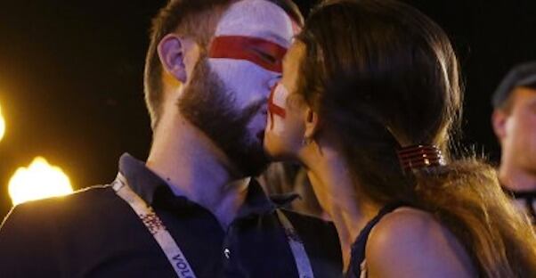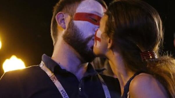 ¿Fue mano o no? Una pareja decidió ponerle emoción al partido entre Dinamarca y Australia, y mientras se debatía una jugada polémica, él le “metió mano” a su novia.