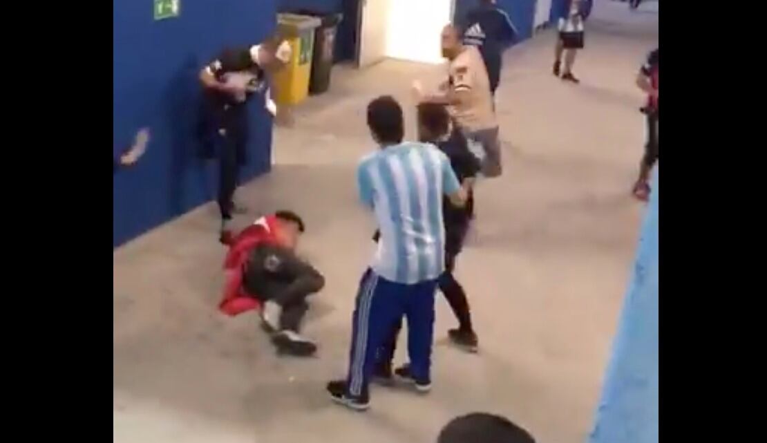 El video fue grabado desde un celular y muestra cómo dos aficionados de Croacia son lanzados al suelo por hinchas argentinos quienes los agarran a puñetazos y patadas en uno de los pasillos del estadio Nizhni Novgorod.