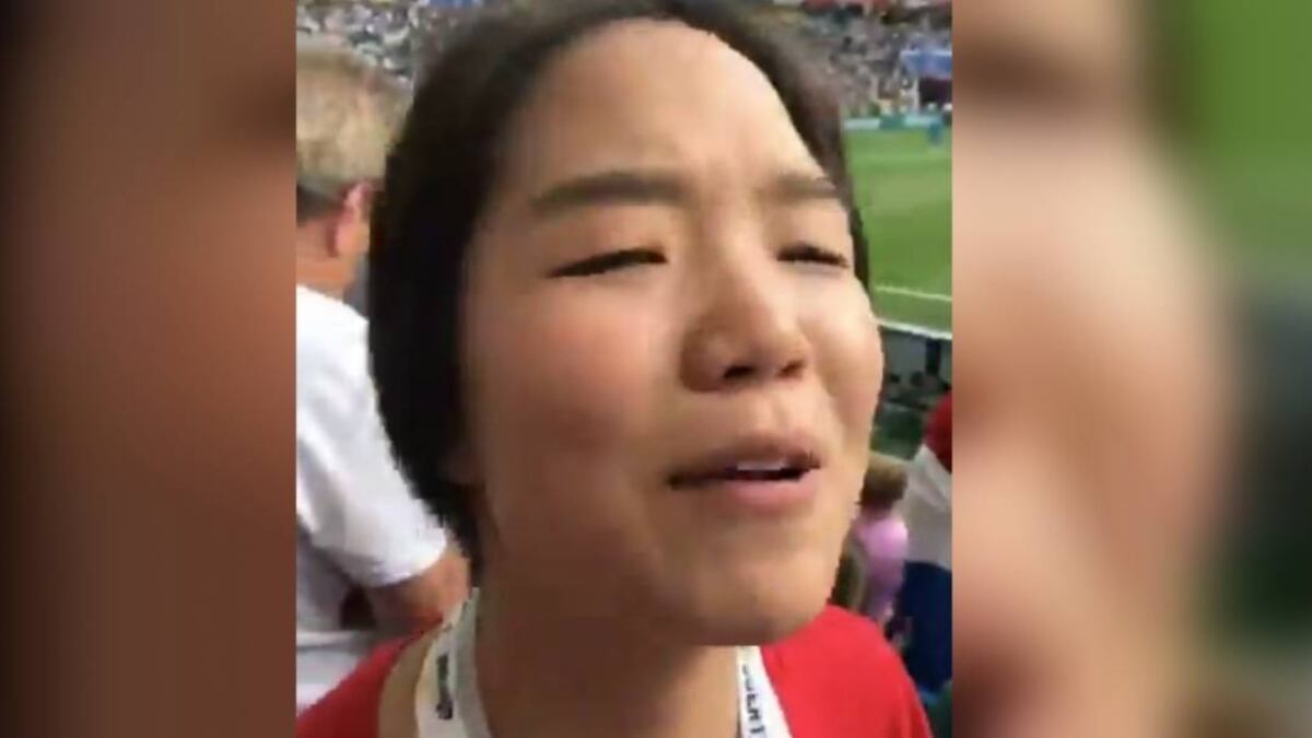 La joven rusa, sin tener idea de lo que significa la frase, les sigue la corriente. Los fanáticos se ríen y continúan gritando la frase que significa: ¡Vagina rosa, vagina rosa!