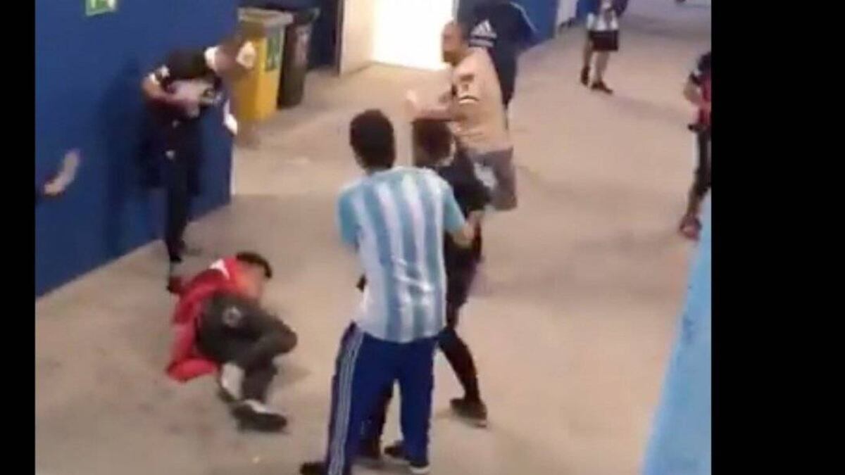 Imágenes grabadas con un teléfono móvil mostraron especialmente a dos aficionados croatas en el suelo, golpeados con puñetazos y patadas por cuatro argentinos, en un pasillo de acceso a las tribunas del estadio de Nizhi Nóvgorod.