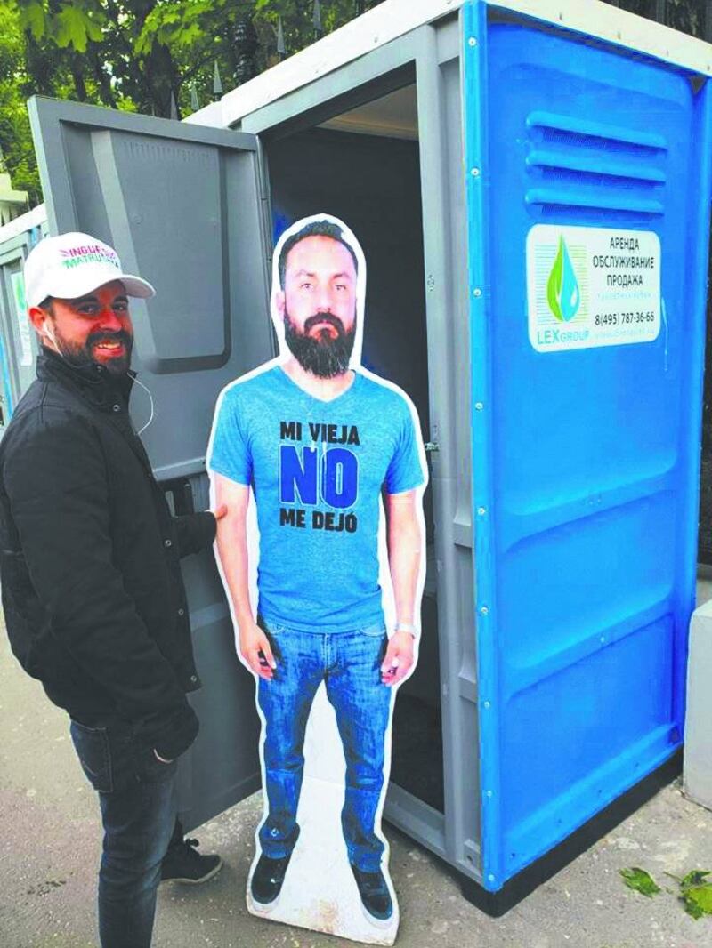El modelo de Javier también tiene "necesidades". Se las arregló para visitar los baños móviles de Moscú.