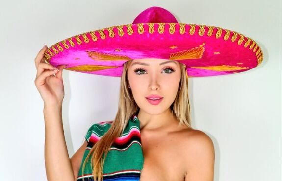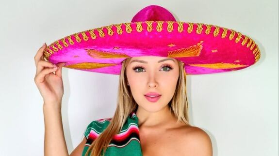 En la foto se le aprecia sin ropa interior y solamente cubre sus partes íntimas con un zarape, una prenda tradicional de México, además luce un sombrero de charro.