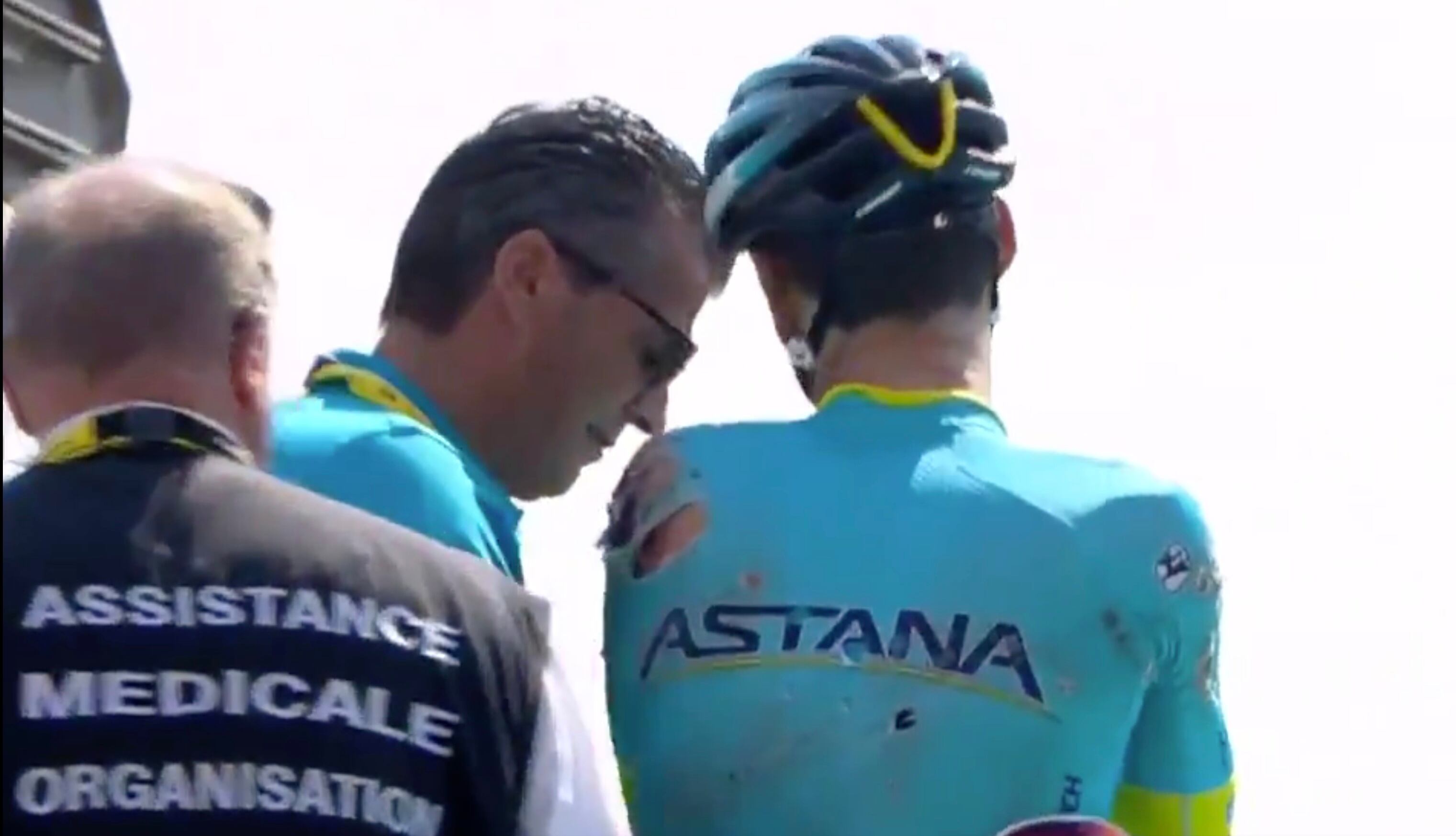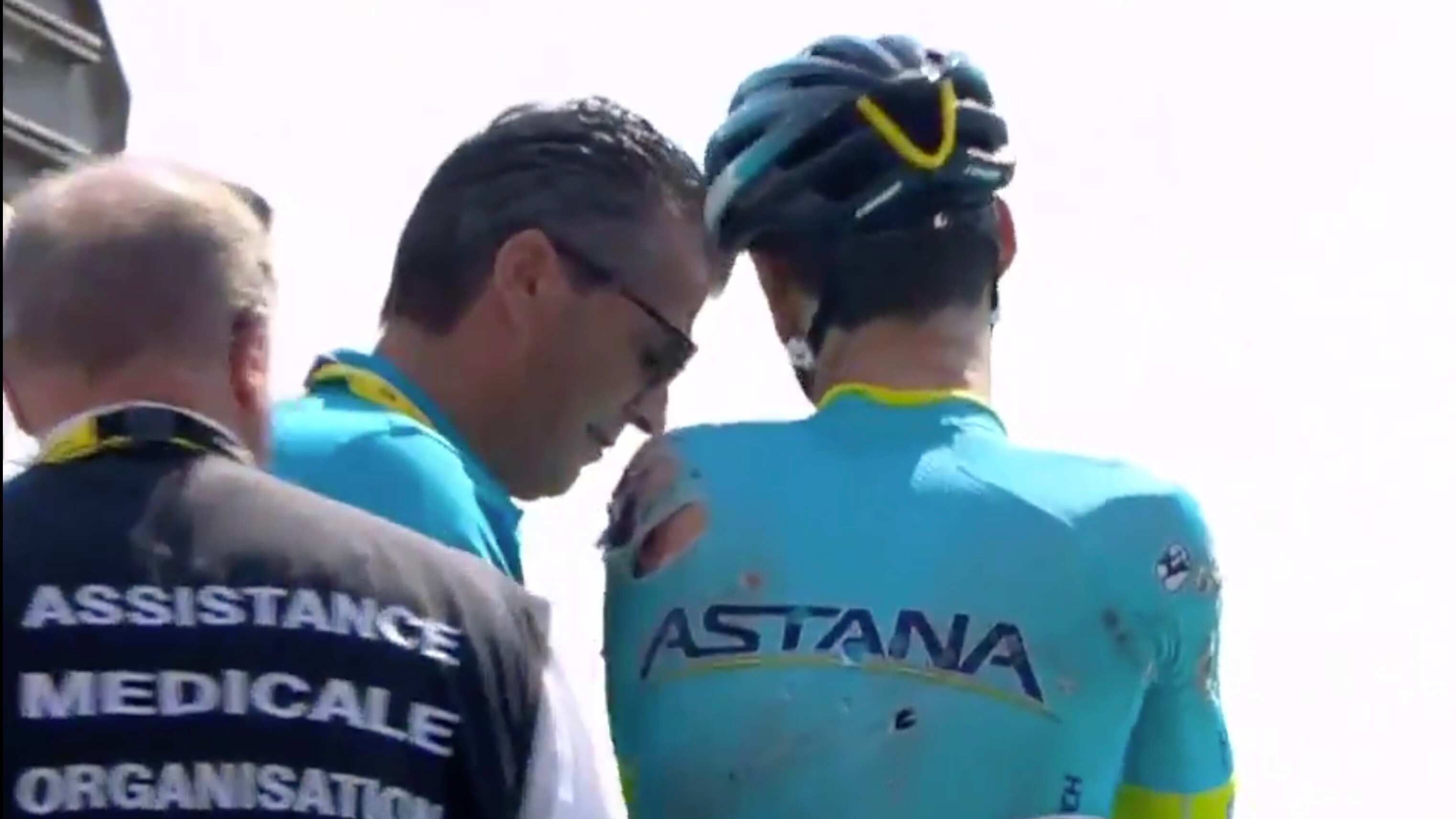 El pedalista del Astana sufrió una fuerte caída a 50 kilómetros del final de la segunda etapa entre Mouilleron Saint Germain y La Roche Sur Yon. El español se mostró muy adolorido y trató de ver si estaba en condiciones de seguir, al ir a montarse en la bicicleta no pudo continuar.