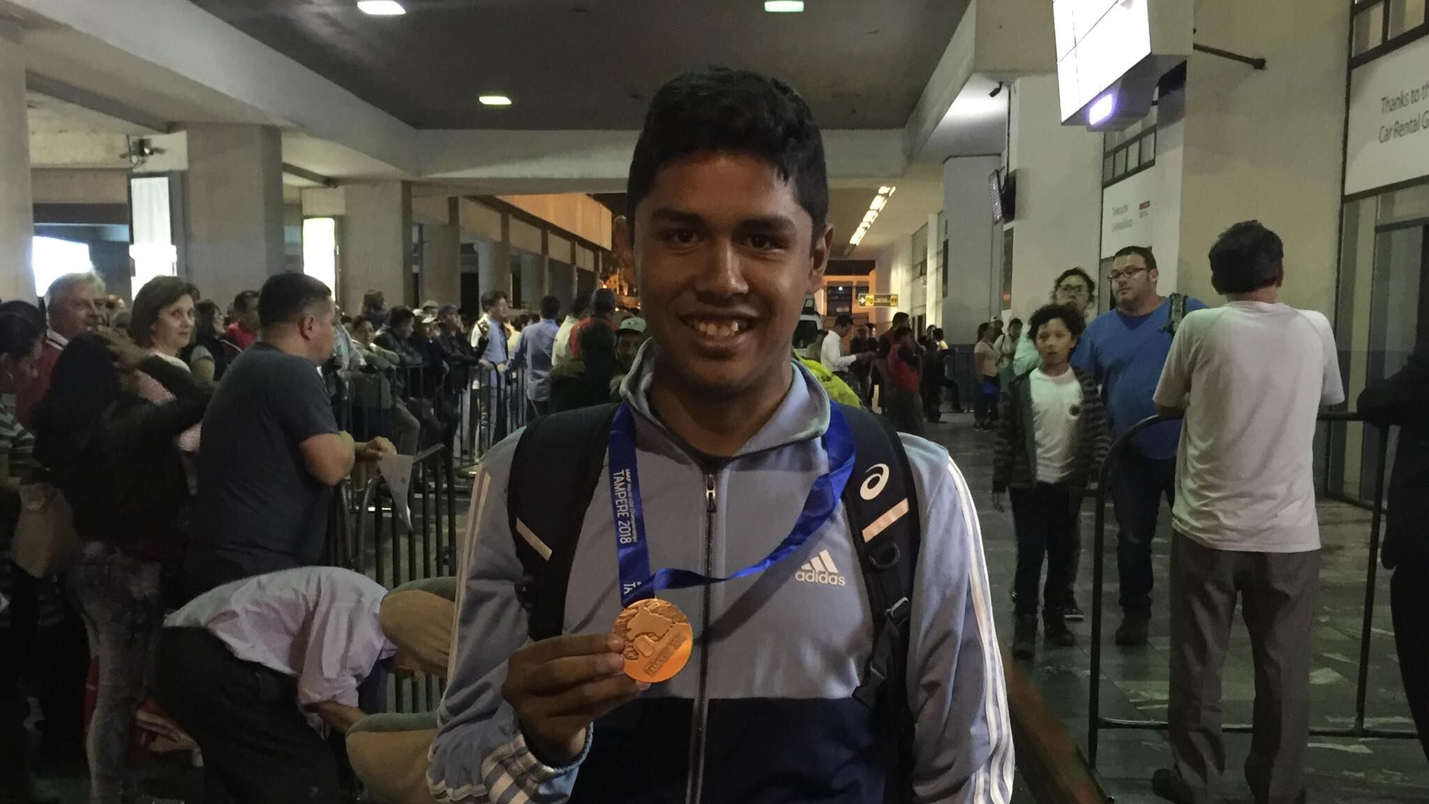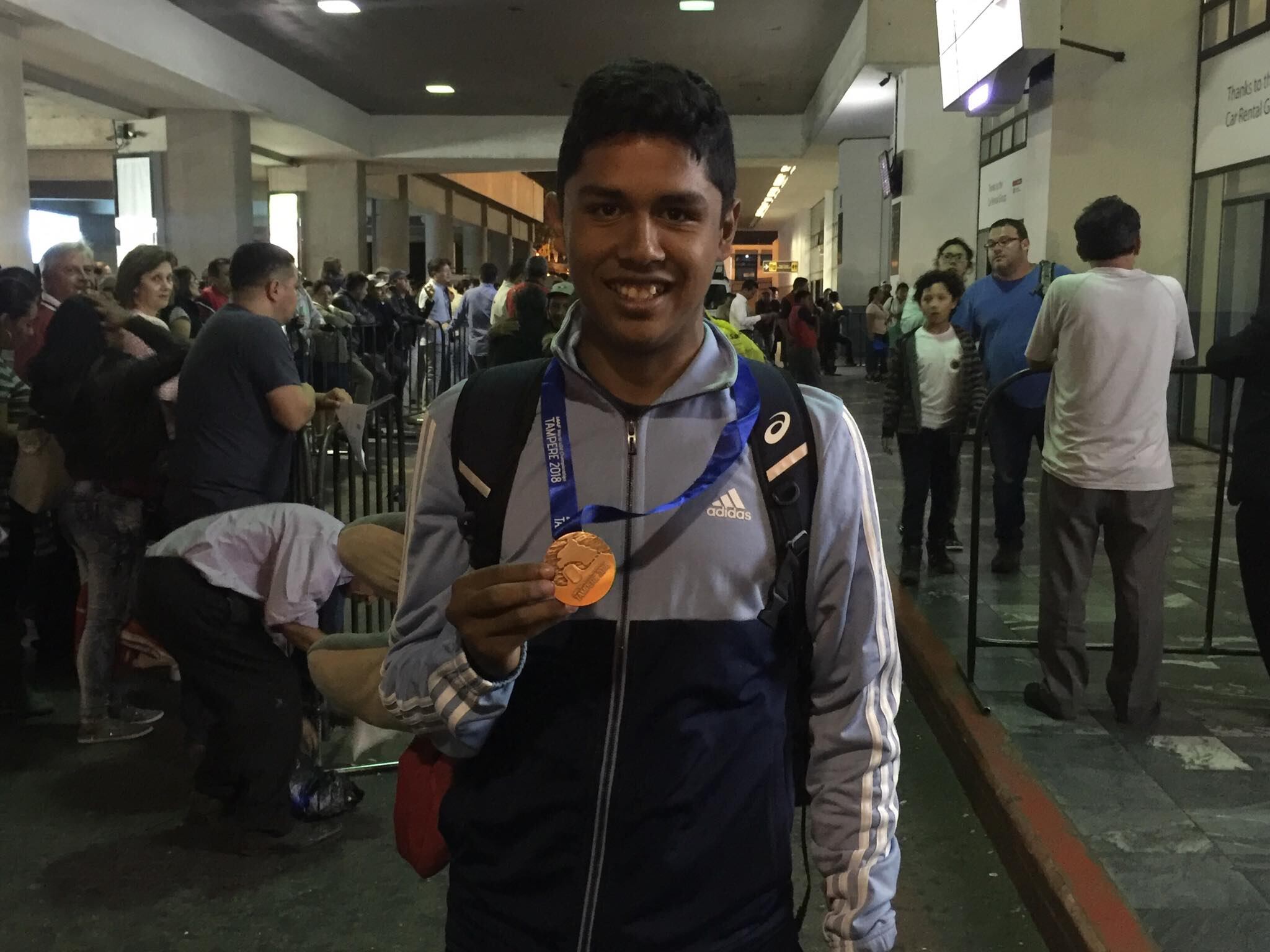 Acompañado por Mynor Ortiz, su entrenador y tío, José Eduardo se mostró alegre de encontrarse con sus familiares que le esperaban en el aeropuerto y a quienes les compartió la medalla junto con un fuerte abrazo.