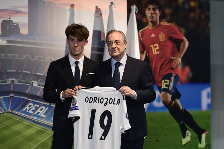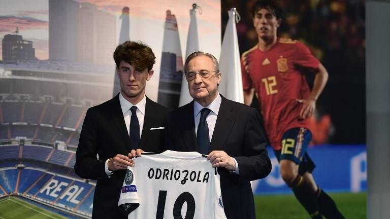 Florentino Pérez, presidente del Real Madrid, le dio la bienvenida a su nuevo jugador, poco antes que él (Odriozola) leyera un discurso.