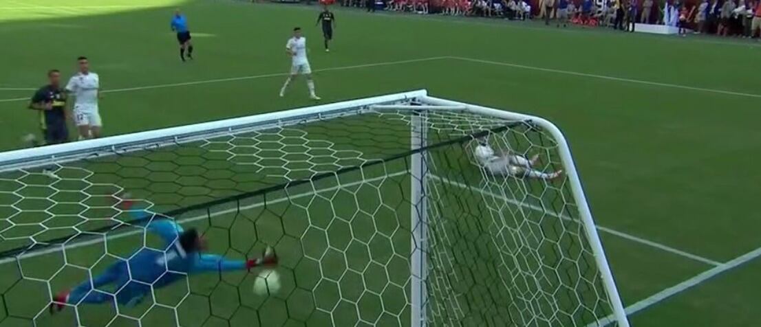 El guardameta costarricenses dio dos pasos hacia adelante para intentar detener el esférico, pero no pudo, y su manotazo solo permitió que el balón continuara su trayectoria para el 1-0 en el minuto 13.