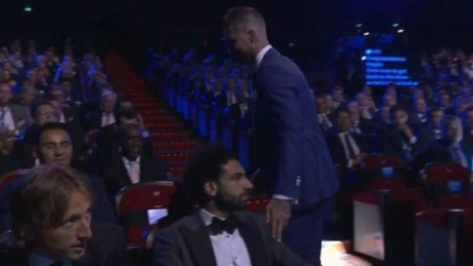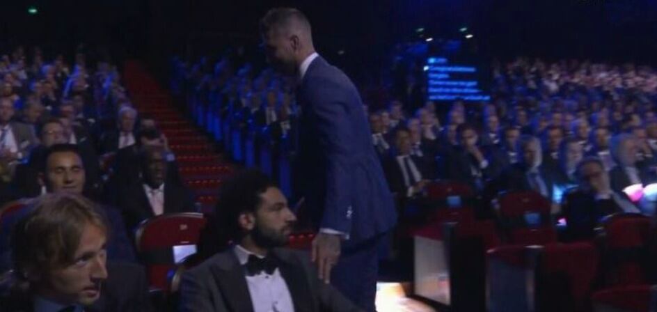 Ramos entregó el trofeo a una de las encargadas del evento y regresó a su asiento, que estaba justo detrás del del egipcio, Mohamed Salah, quien estaba nominado a Mejor jugador de Europa.