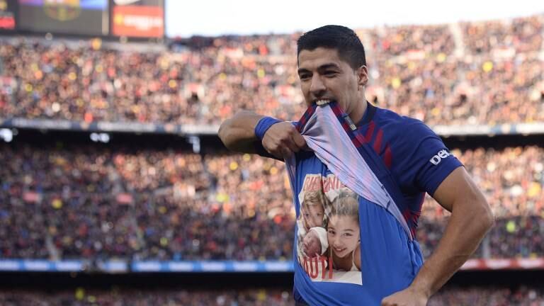 Tras vencer a Thibaut Courtois desde los once pasos, Suárez corrió hacia la tribuna y se levantó la camiseta, mostrando una playera que llevaba debajo, estampada con los rostros de sus tres retoños.