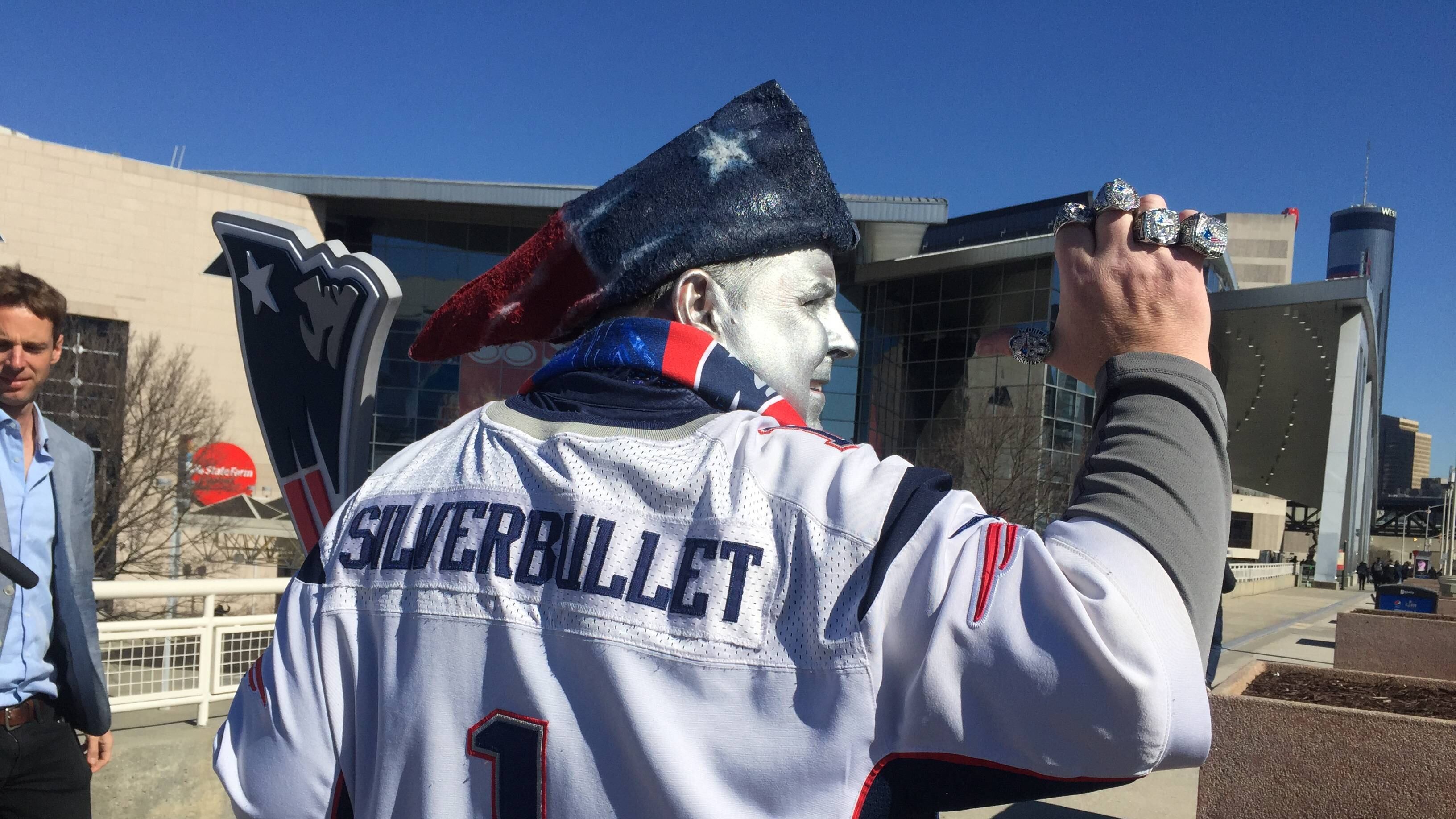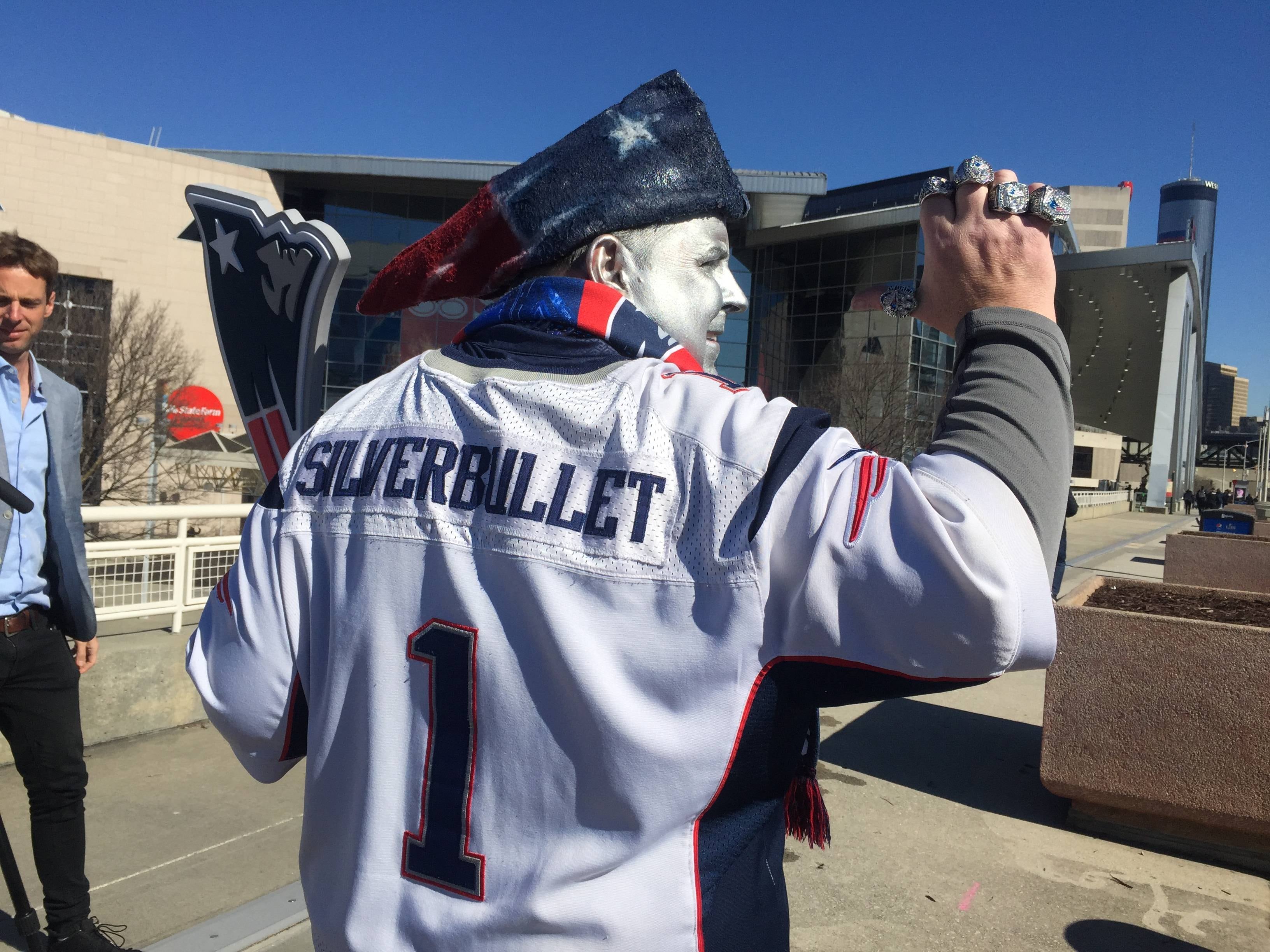 Inconfundible fanático de los Patriots, el "Silver Bullet" llama la atención de muchos a las afueras del Mercedes-Benz Stadium.