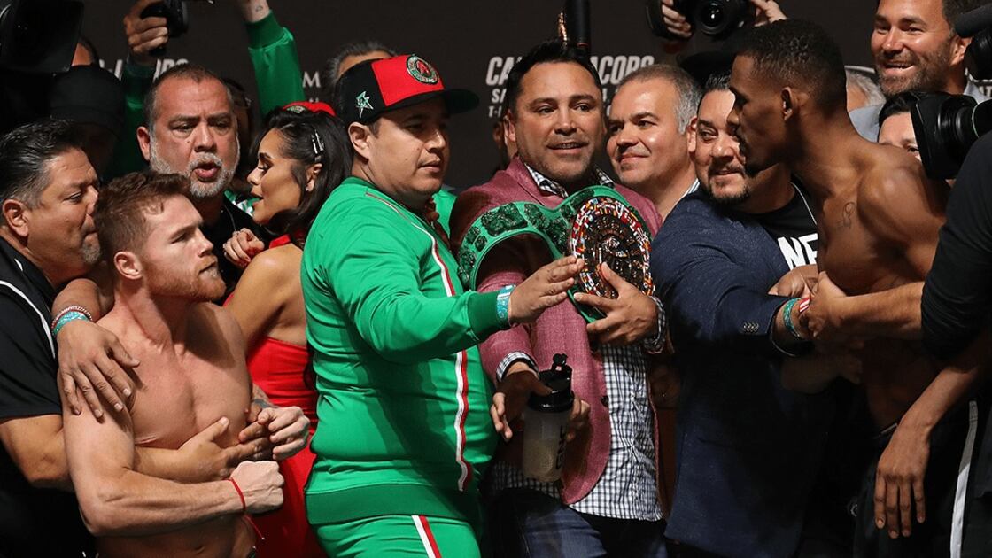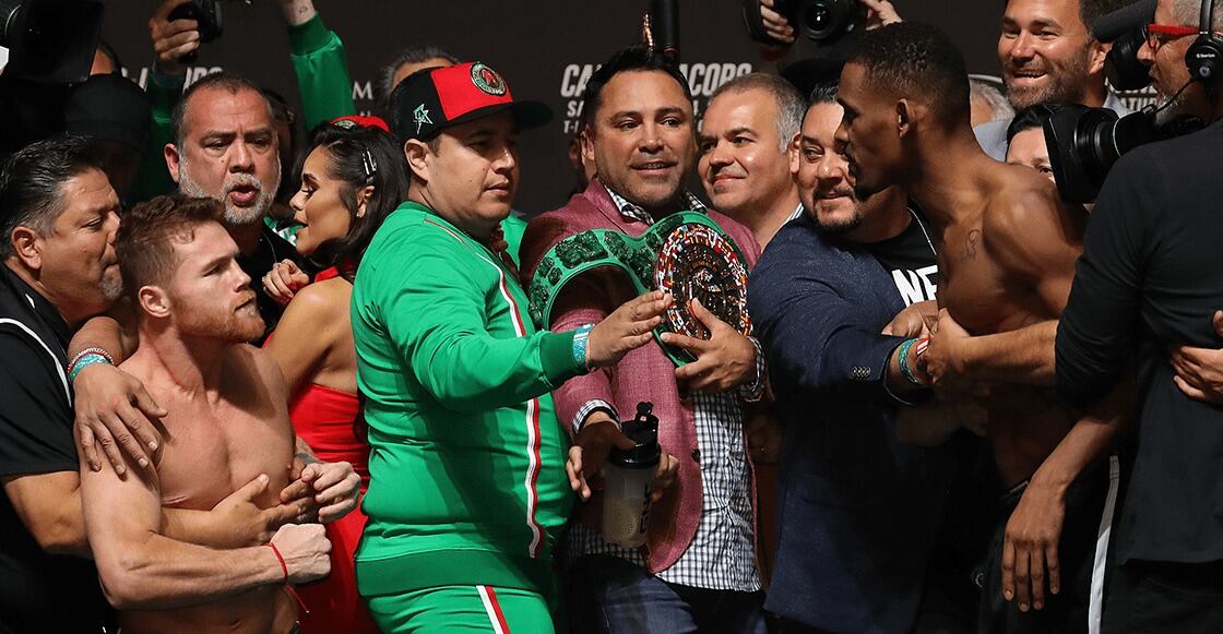 Los ayudantes de Saúl "Canelo" Álvarez y Jacobs tuvieron que separarlos antes de iniciar una escaramuza mayor, y fue lo más emocionante de una ceremonia monótona como lo ha sido toda la promoción, sin ningún tipo de aliciente deportivo ni de protagonismo por parte de los dos púgiles.