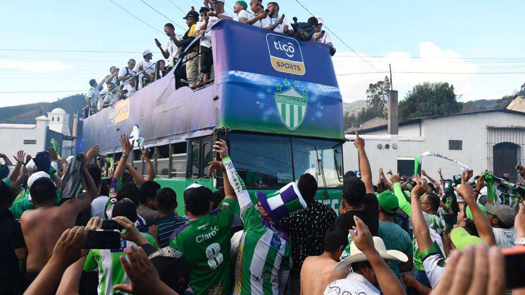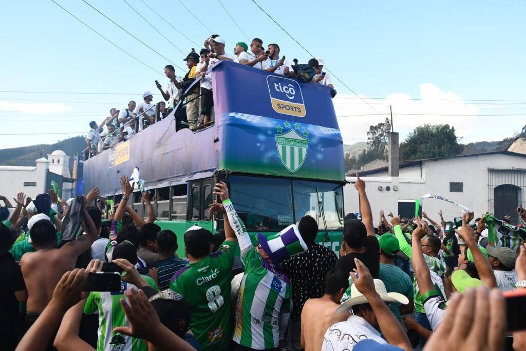 El bus, el cual está adornado con el escudo y los colores de Antigua GFC, llegó al parque central de la ciudad colonial, donde otros cientos de hinchas panza verde estuvieron esperando a sus ídolos.