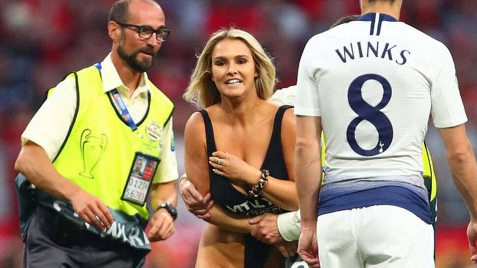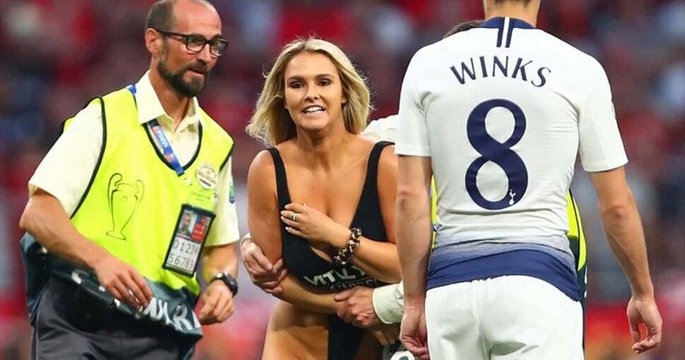 Fue en el minuto 19 de la final de la Champions League cuando la bella rubia saltó a la gramilla con un ajustado bikini, y mostró sus encantos a los más de 68 mil espectadores.
