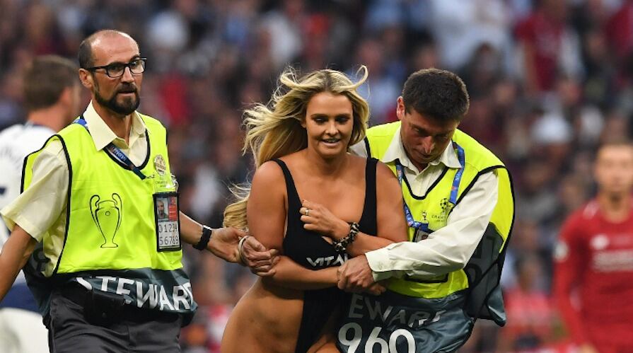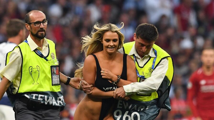 Sin ningún complejo, la hermosa modelo rusa se quitó la ropa y saltó a la cancha donde se enfrentaban el Tottenham y el Liverpool.