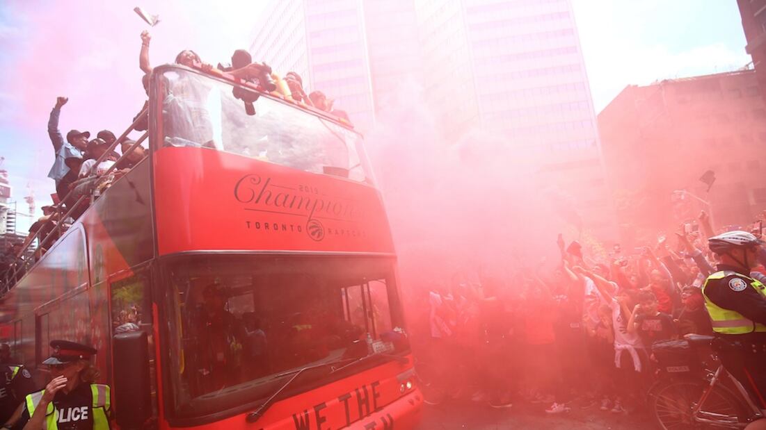Y es que miles de aficionados se reunieron en Toronto para ver el paso de sus héroes, que se trasladaban en un autobús sin techo.