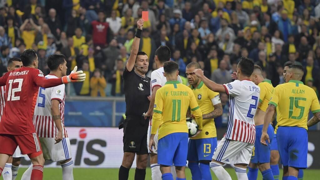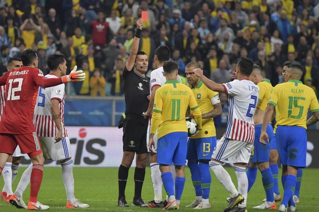 Paraguay jugó con 10 desde el minuto 58, por la expulsión con roja directa de Fabián Balbuena, que derribó al borde del área a Roberto Firmino cuando era el último defensor.
