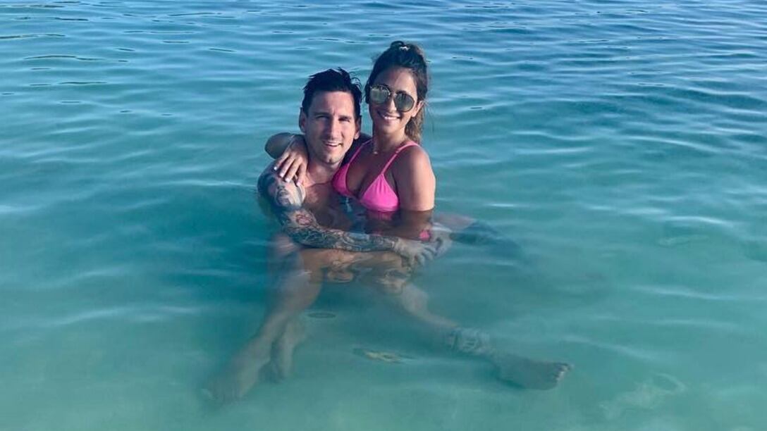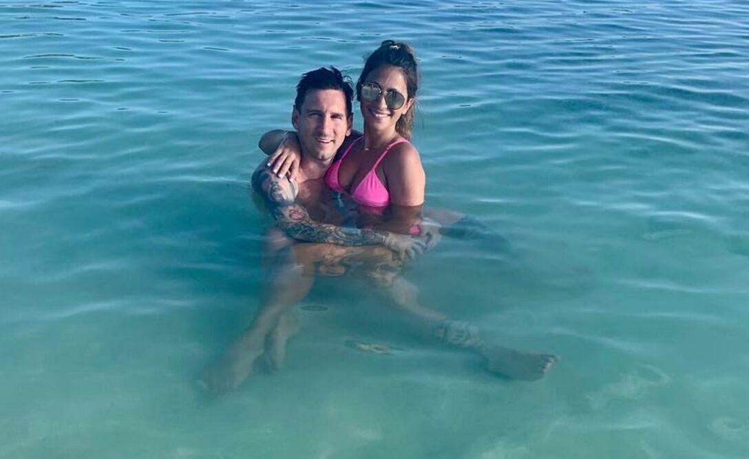 Junto a ella está Messi, sin camisa, dentro del mar que luce hermoso.