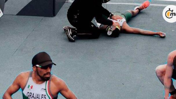 Llegando a la meta, Pérez se desplomó debido a lo exigente que había sido la prueba.