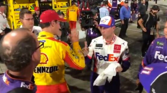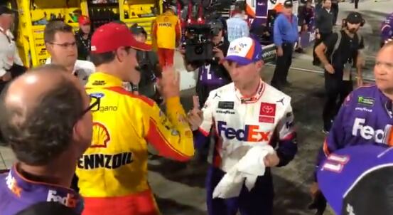 Los dos pilotos empezaron a discutir airadamente y Hamlin dio un golpe en el hombro a Logano, que no dudó en abalanzarse contra su rival, los que rodeaban a los pilotos tuvieron que separarlos.