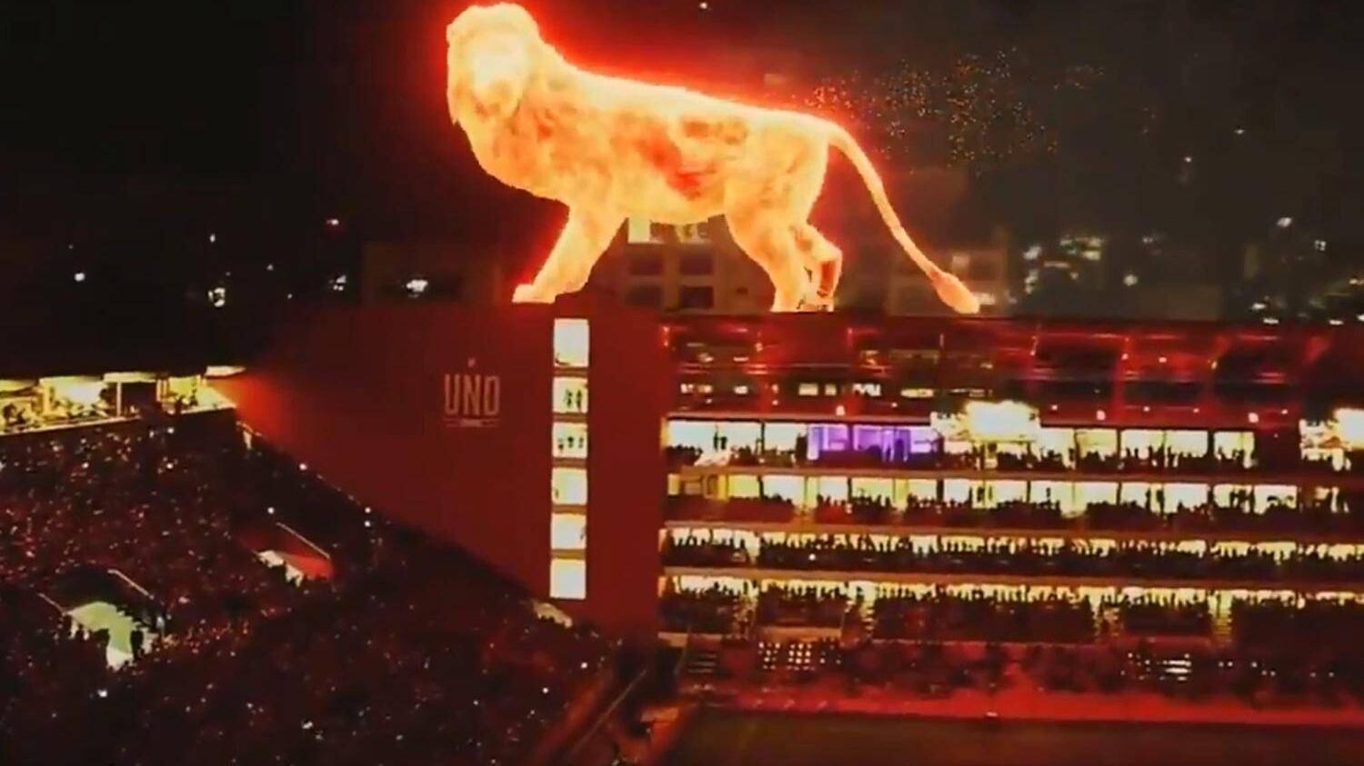 Fue entonces cuando los aficionados se impresionaron con la proyección de un león de fuego que caminaba sobre el estadio.
