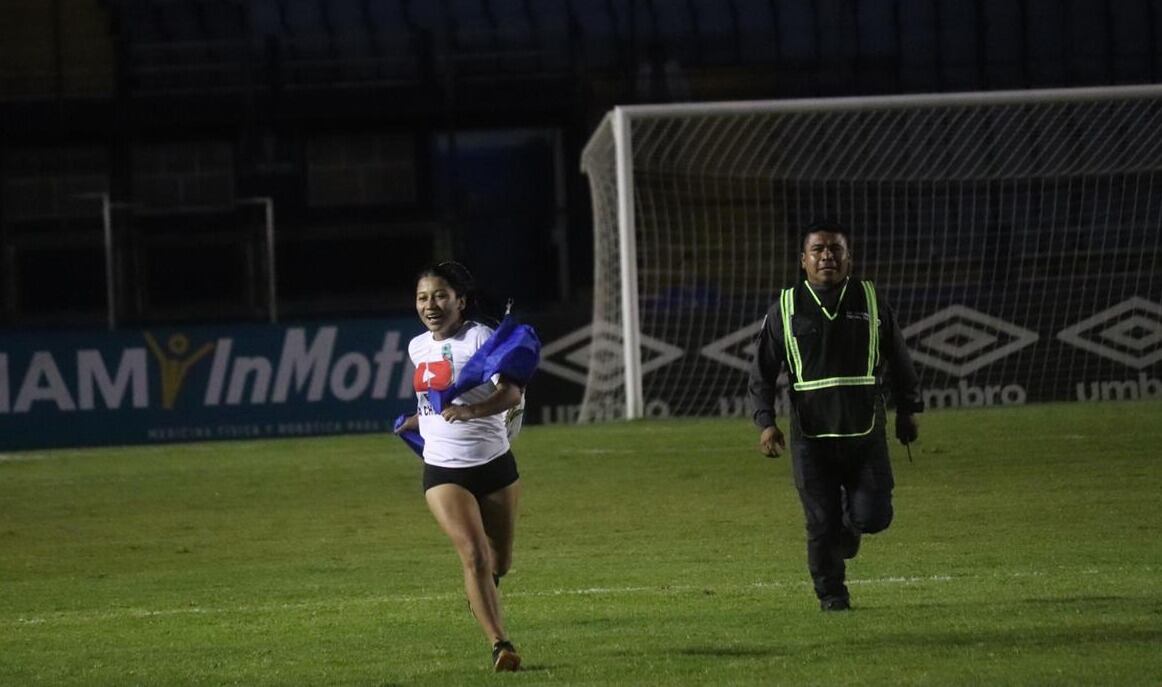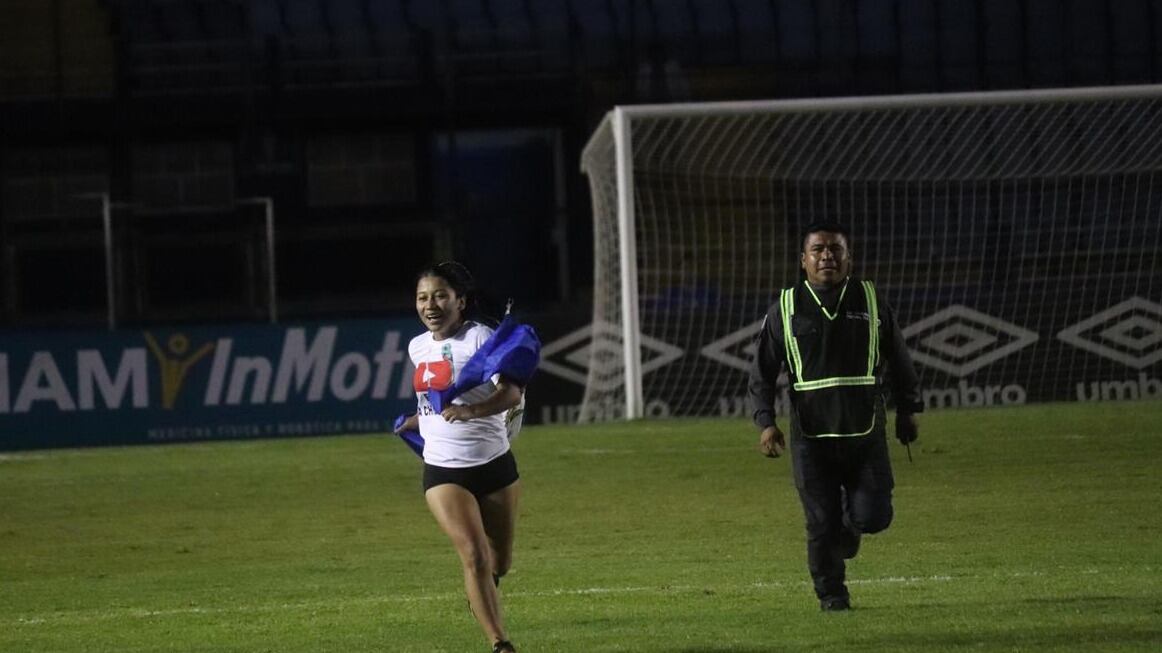 Una aficionada burló a la seguridad e ingresó a la gramilla del estadio Nacional Doroteo Guamuch Flores.