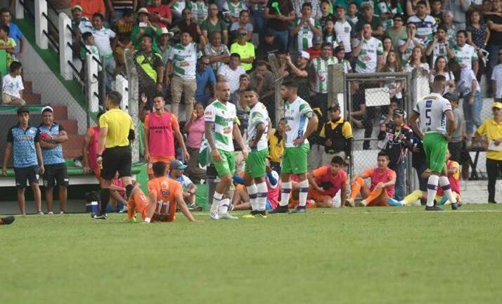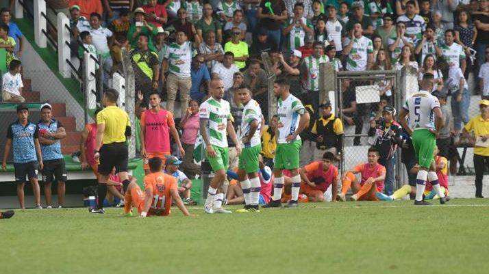 Los futbolistas sanaratecos decidieron sentarse en el terreno de juego como medida de protesta, misma que fue ordenada por Rafael Díaz, técnico de Sanarate.