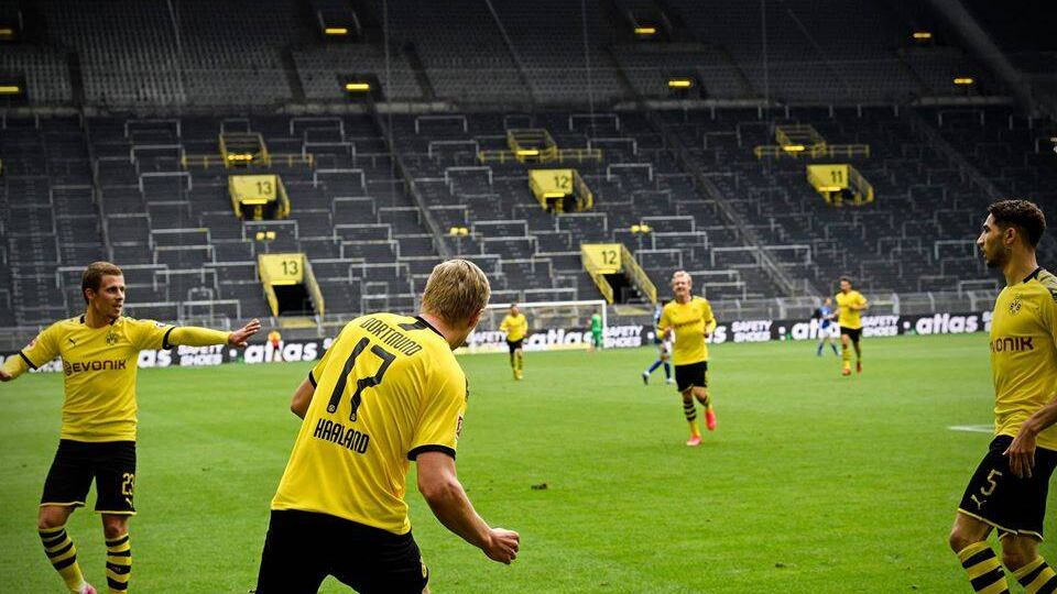 El joven noruego Erling Haaland celebró el primer gol con cierto distanciamiento, fue el inicio de la goleada de Dortmund sobre su rival.