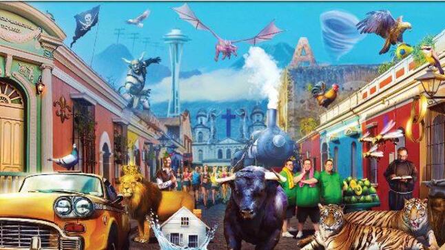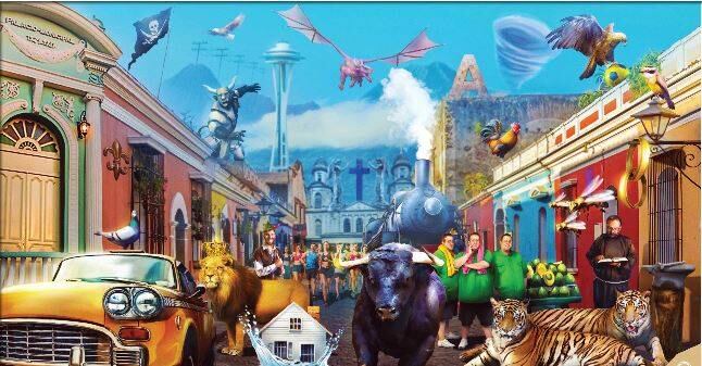 La segunda sería el ambiente donde se desarrolla el mural, que es una clara referencia a la ciudad de Antigua Guatemala.
