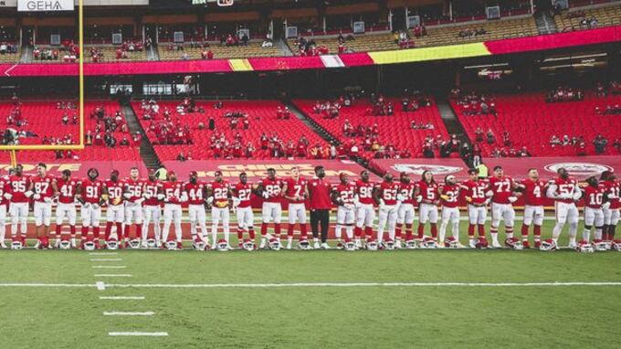 Los jugadores de Kansas City sí estuvieron en el campo todos de pie, salvo el jugador afroestadounidense Alex Okafor que hincó una rodilla en el césped, replicando el emblemático gesto popularizado por la ex estrella de la NFL Colin Kaepernick.