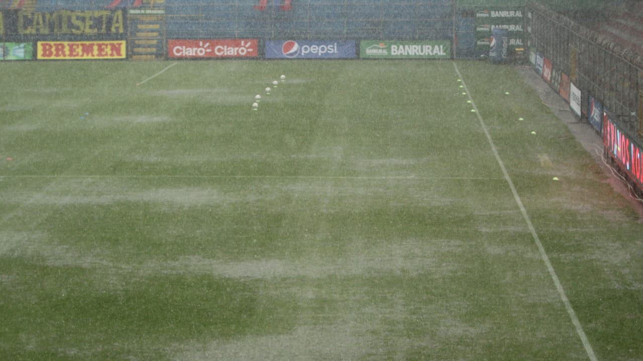 La cancha del estadio El Trébol quedó en mal estado por la fuerte lluvia que ha prevalecido en la capital guatemalteca.