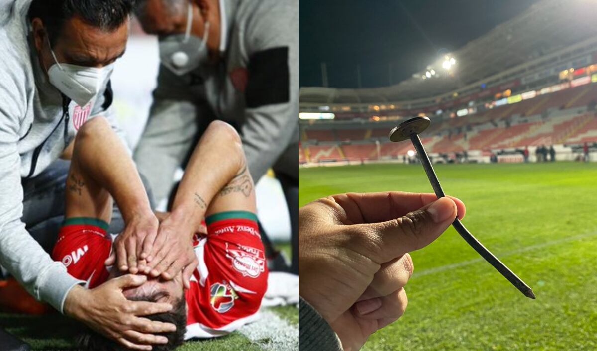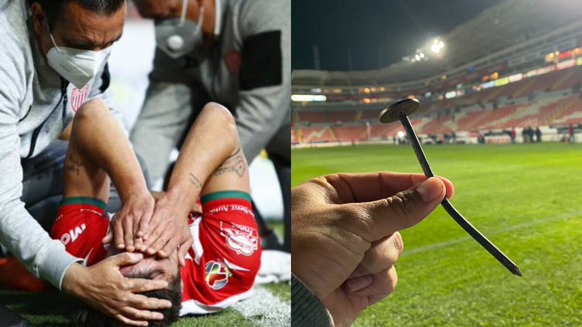 Sin embargo, para su mala fortuna uno de los clavos que fija la manta al terreno de juego estaba mal colocado, lo que provocó una aparatosa lesión, donde el jugador español del Necaxa se llevó la peor parte, saliendo con lágrimas de la cancha.