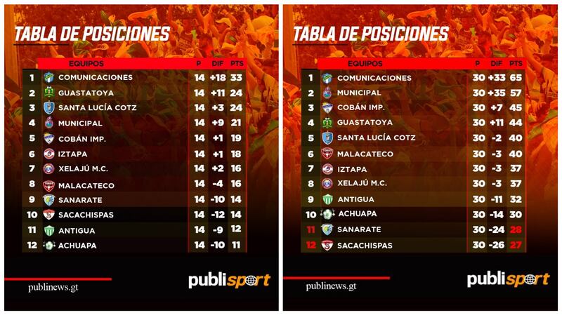 Por su lado, Achuapa continúa sufriendo por no perder la categoría, pues se encuentra cerca de la zona de descenso, es antepenúltimo en la tabla acumulada con 30 puntos, por delante de Sanarate (28) y Sacachispas (27), por lo que las dos últimas jornadas serán de “vida o muerte” para el representativo de Jutiapa.