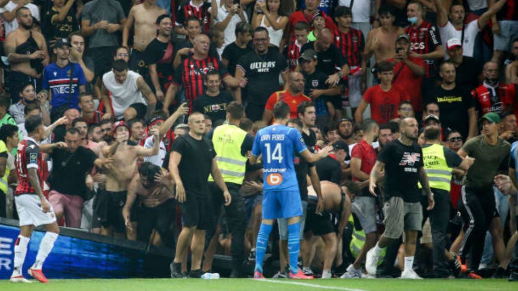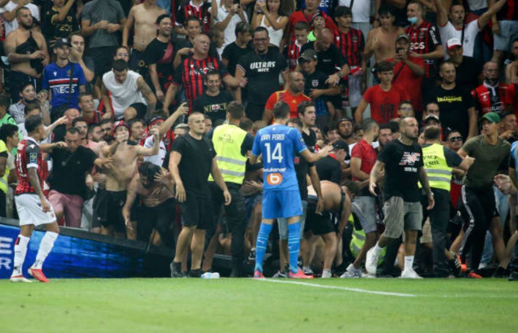 El partido Niza-Marsella fue detenido el domingo una hora y media después de que los aficionados locales invadiesen el terreno de juego después de un incidente previo: el jugador visitante Dimitri Payet devolvió a la grada una de los muchas botellas de plástico que le lanzaban cuando se disponía a sacar un córner.