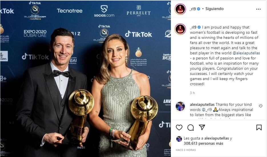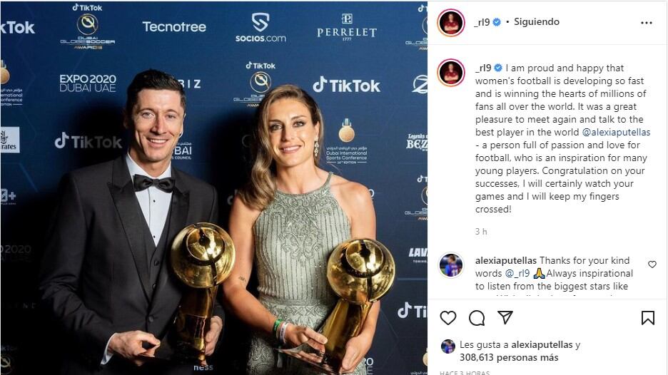 Mensaje de Robert Lewandowski a Alexia Putellas.El polaco elogió a la jugadora que en dicho evento también fue nombrada como la jugadora del año. “Fue un gran placer encontrarte de nuevo y hablar con la mejor jugadora del mundo Alexia Putellas”, comentó Robert.