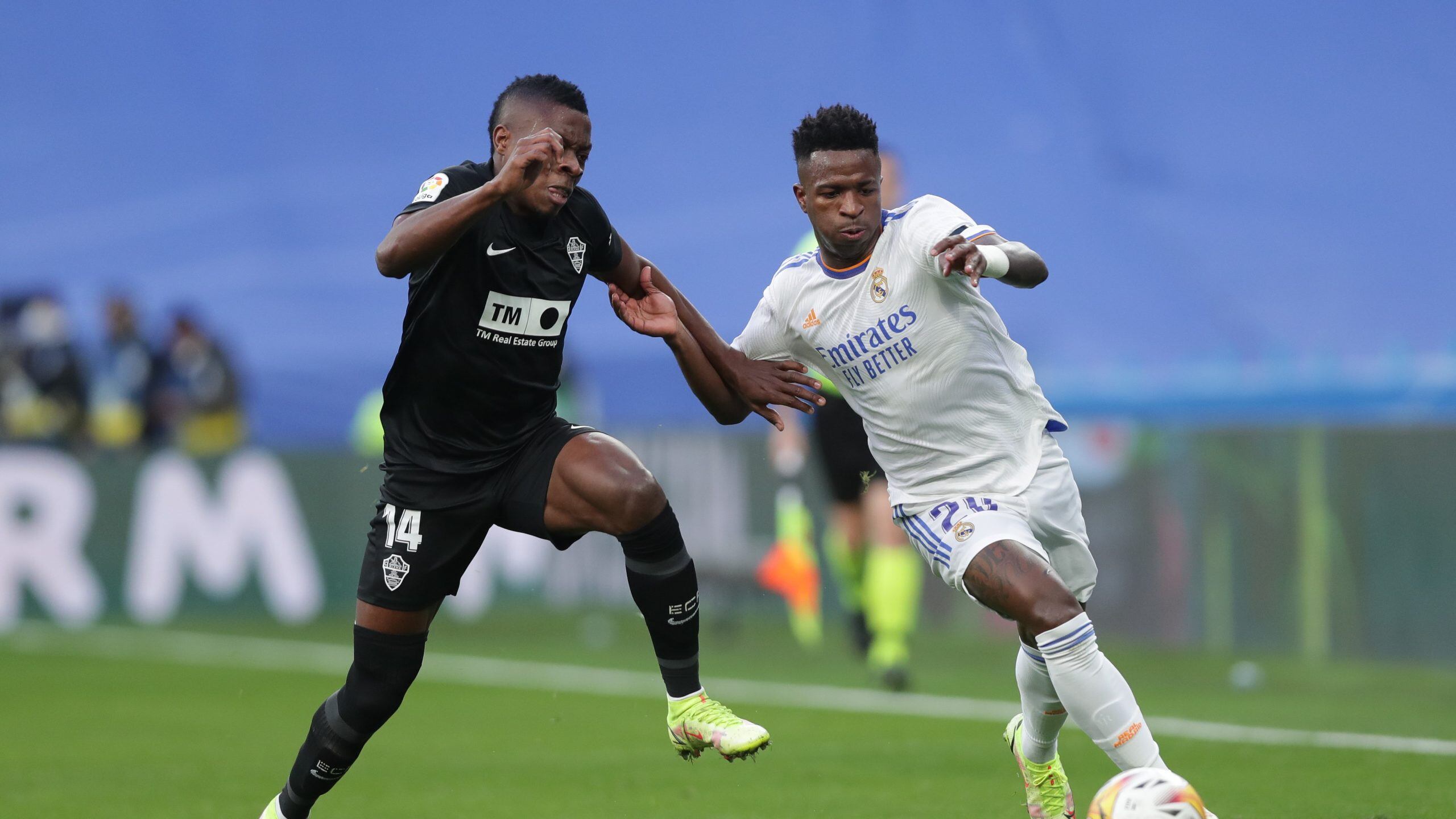 El Real Madrid comenzó de la mejor manera el encuentro, el dominio del balón era para los blancos. La primera jugada de gol llegó luego de una serie de pases entre Benzema y Vinicius, paredes que dejaron desmarcado al brasileño quien no pudo definir y con poco ángulo falló frente al arquero del Elche al 11′.