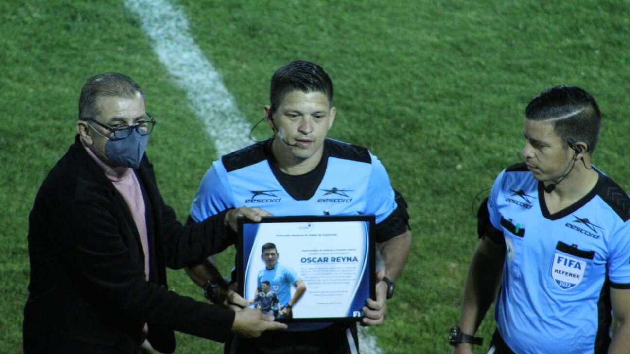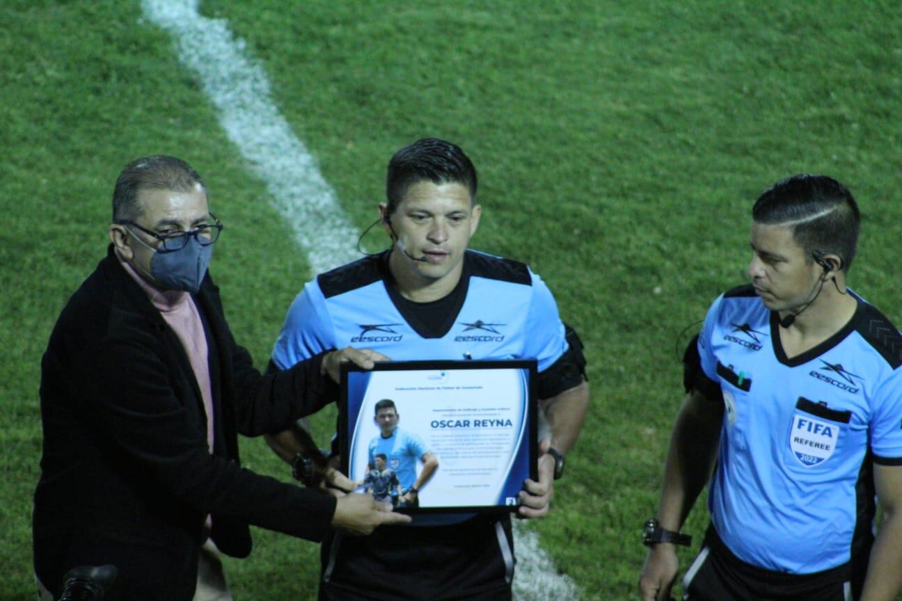 Previo al inicio del encuentro, Reyna recibió una placa conmemorativa de parte del comité de árbitros, la cual era entregada como reconocimiento a su amplia carrera que inició en la Liga Mayor en 2006 con un duelo, en el mismo Mario Camposeco, entre Xelajú MC y Jalapa.