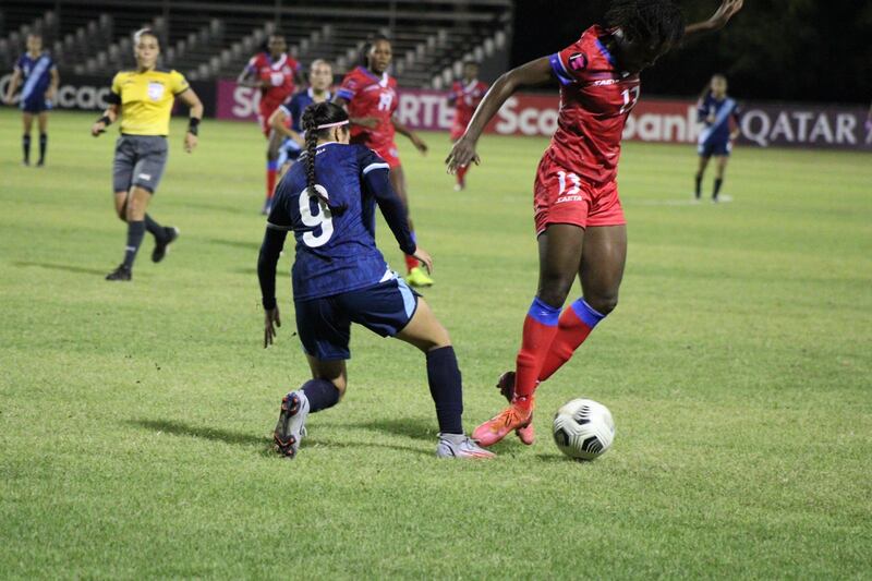 El juego comenzó con gran presión por parte de la selección de Haití, que buscaba hacer daño por arriba, sabiendo que tenían buena ventaja por la altura de sus jugadoras.