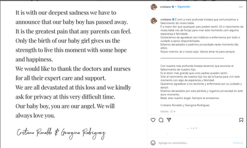 “Con nuestra más profunda tristeza tenemos que anunciar el fallecimiento de nuestro hijo. Es el dolor más grande que unos padres pueden sentir. Solo el nacimiento de nuestra hija nos da la fuerza para vivir este momento con algo de esperanza y felicidad. Queremos agradecer a los doctores y enfermeras por su cuidado y apoyo. Estamos devastados por esta pérdida y rogamos privacidad en este duro momento. Bebé, eres nuestro ángel. Siempre te amaremos”, publicó Cristiano.