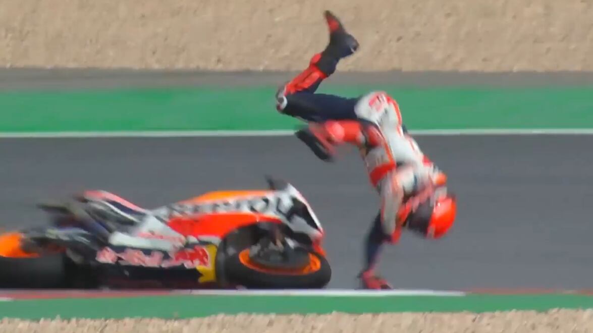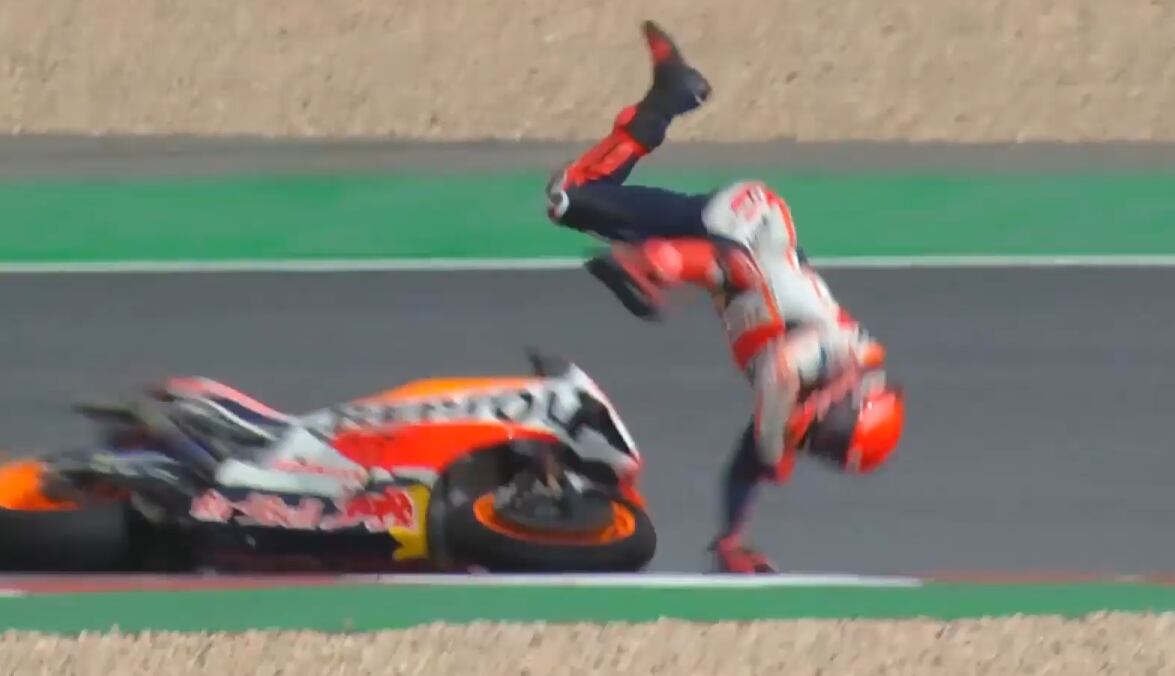 Marc Márquez se golpeó la cabeza después de perder el control de su moto sobre la pista empapada. El piloto catalán no pareció haber sufrido daños. Víctima de numerosas caídas estos últimos meses, ya acumula seis, Márquez se ha perdido ya dos Grandes Premios este año por sus problemas de visión causados por sus caídas.