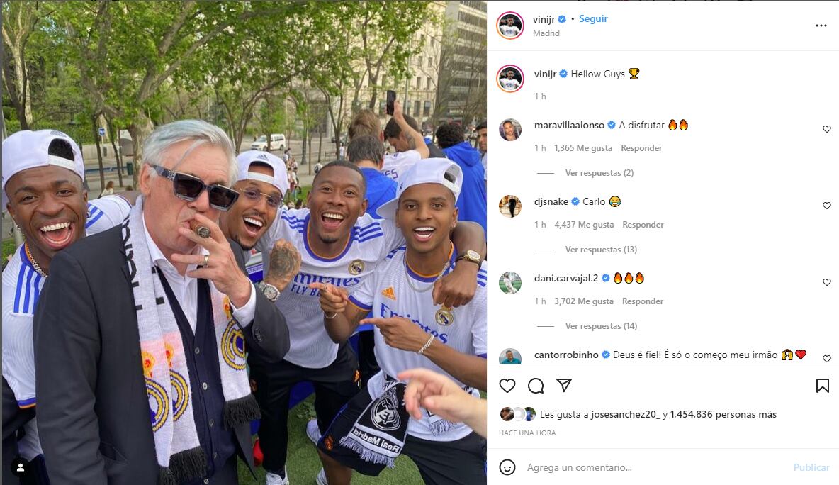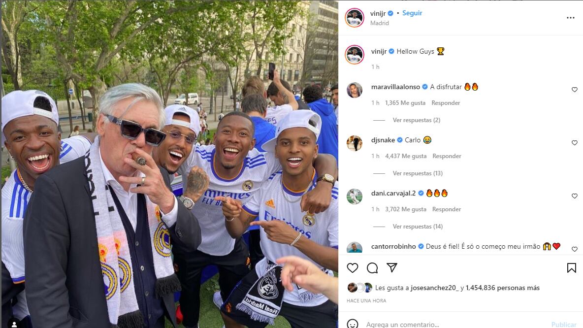 Las imágenes de festejo del título 35 de Liga conquistado para el Real Madrid sigue dejando postales para la historia, esta vez una foto publicada en el Instagram de Vinicius le dio la vuelta al mundo, el protagonista fue Carlo Ancelotti quien posó a su estilo junto algunos jugadores, el italiano quedó enmarcado con gafas de sol y fumando un puro.