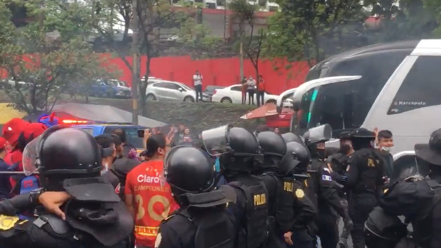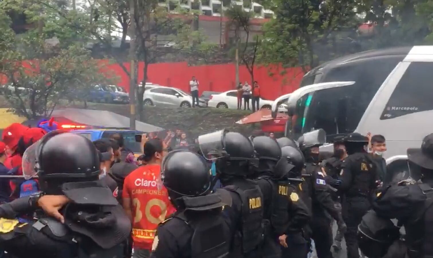 El bus que traslada a cuerpo técnico y jugadores de Comunicaciones llegó al estadio Manuel Felipe Carrera, popularmente conocido como El Trébol, con un poco de retraso debido al intenso tráfico de la ciudad ocasionado por las lluvias.